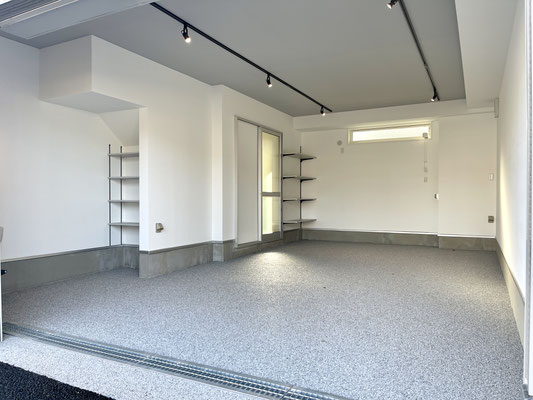 スッキリとしたガレージは愛車がより引き立って見えるシンプル仕様。