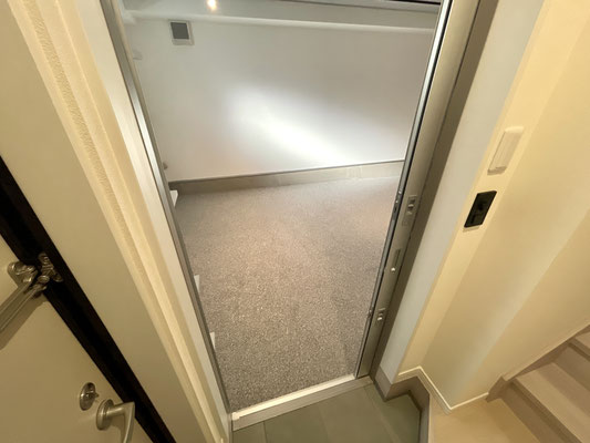 玄関ドアを開けるとすぐ右手にはガレージに通じるスライドドア〜