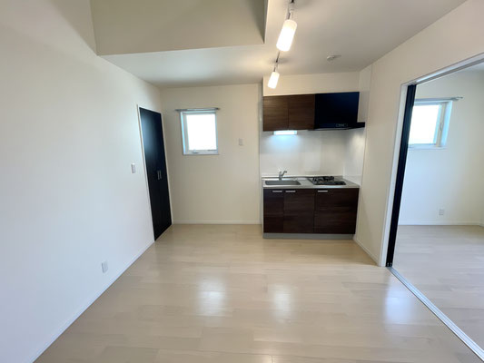 こちらも爽やかな白系のフローリングと焦げ茶色のキッチンが特徴的なお部屋です。