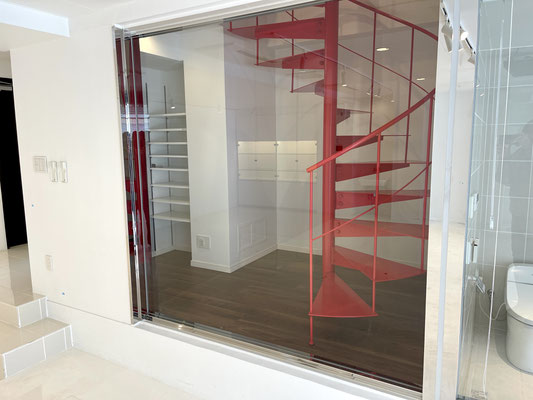 この真っ赤な階段スペースもガラス張りなのでガレージ内を見渡すことが出来ます。