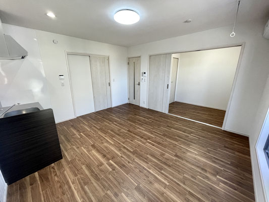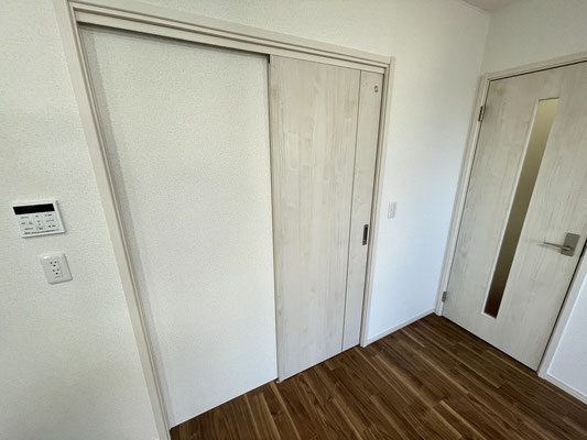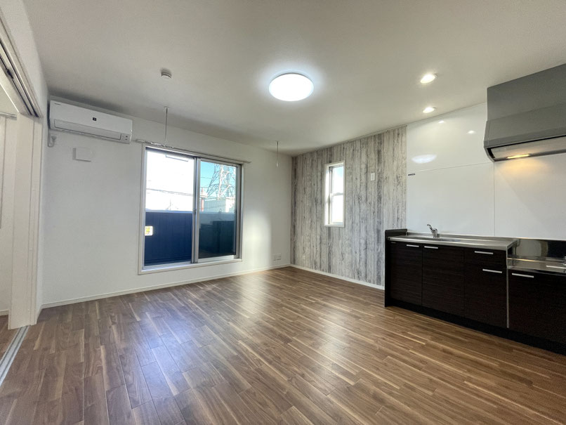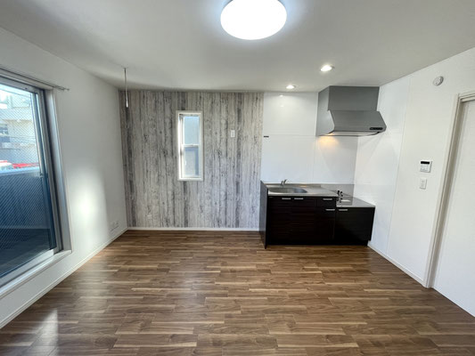 濃いめの色合いのフローリングと白系ウッド調のアクセントクロスが特徴的なお部屋です。