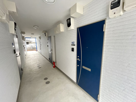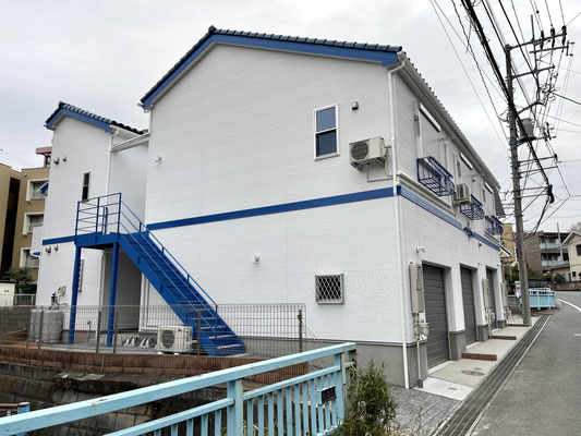 建物外観はホワイトを基調として差し色のブルーが入った爽やかな印象の建物です。