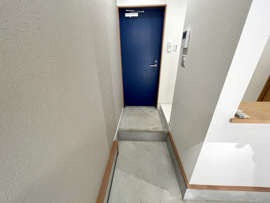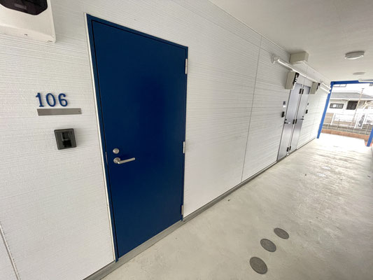 ガレージ奥には特長的なブルーの扉、ガレージ出入り口があります。