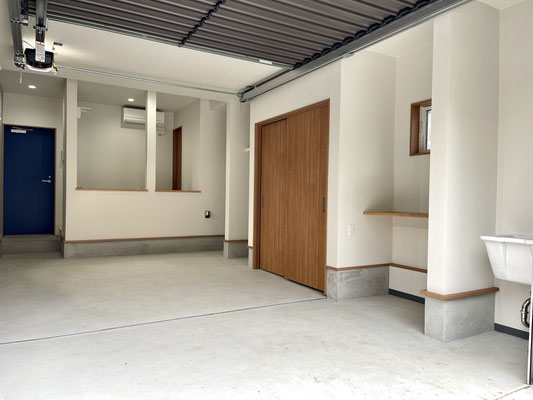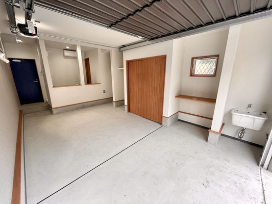 大切な愛車が余裕をもって駐車出来るサイズ感のガレージは設備や収納も盛り沢山♪