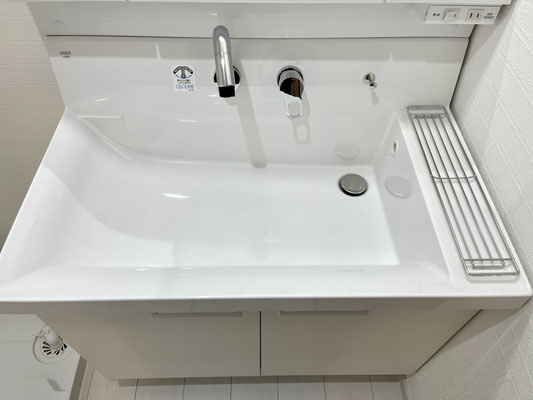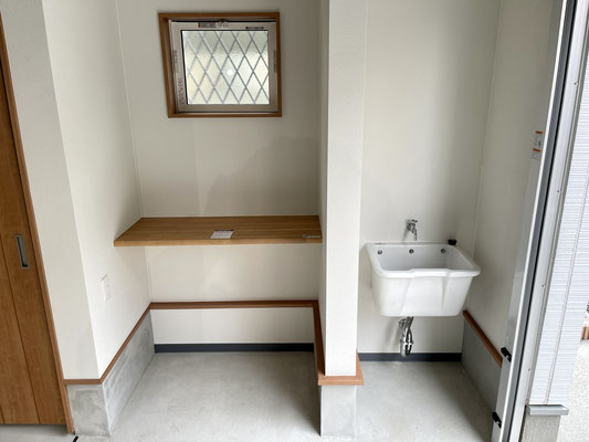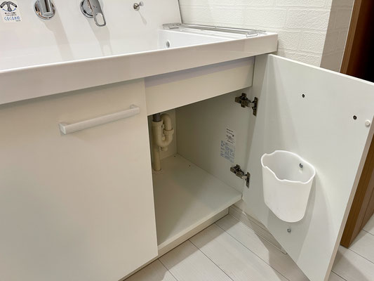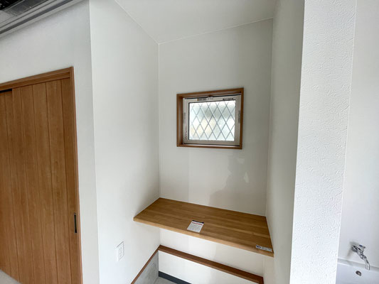 他にも大きな水受けの手洗い水栓や換気が出来る小窓、扉付きの収納スペース、