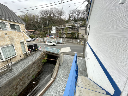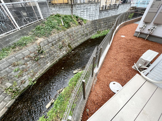 隣の建物は小川を挟んで隣接になるので大きな開放感があります。