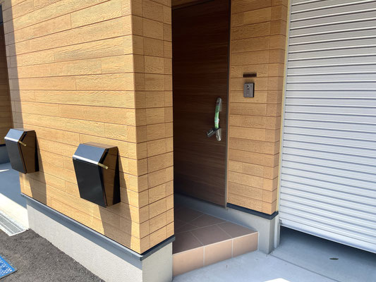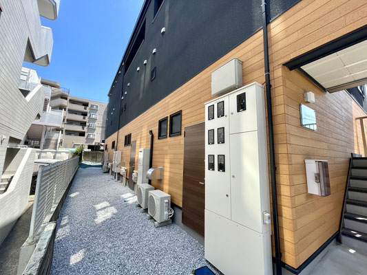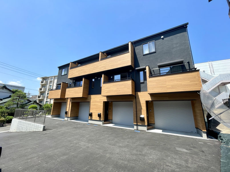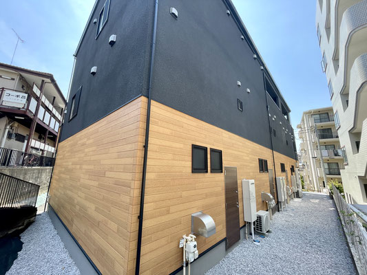 建物外観はブラックとウッド調のツートンカラー。