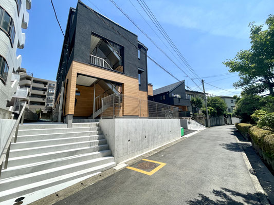 道路からは高低差がある丘陵地帯に建設されているモダンでスタイリッシュな建物。