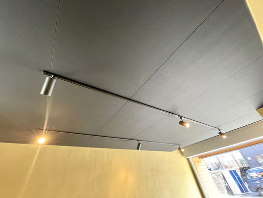 ブラックな天井には2本のライトレールがあり愛車やガレージ内を照らしてくれます。
