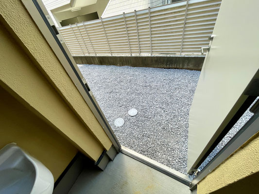 さて、キッチンの裏手には鍵付きスライドドアがあり、開けると水まわりにアプローチ出来ます。