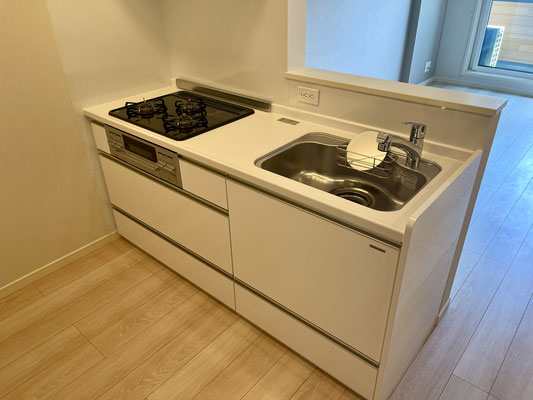 収納たっぷりなキッチンは3口+グリル付きコンロでお料理好きも納得の設備!