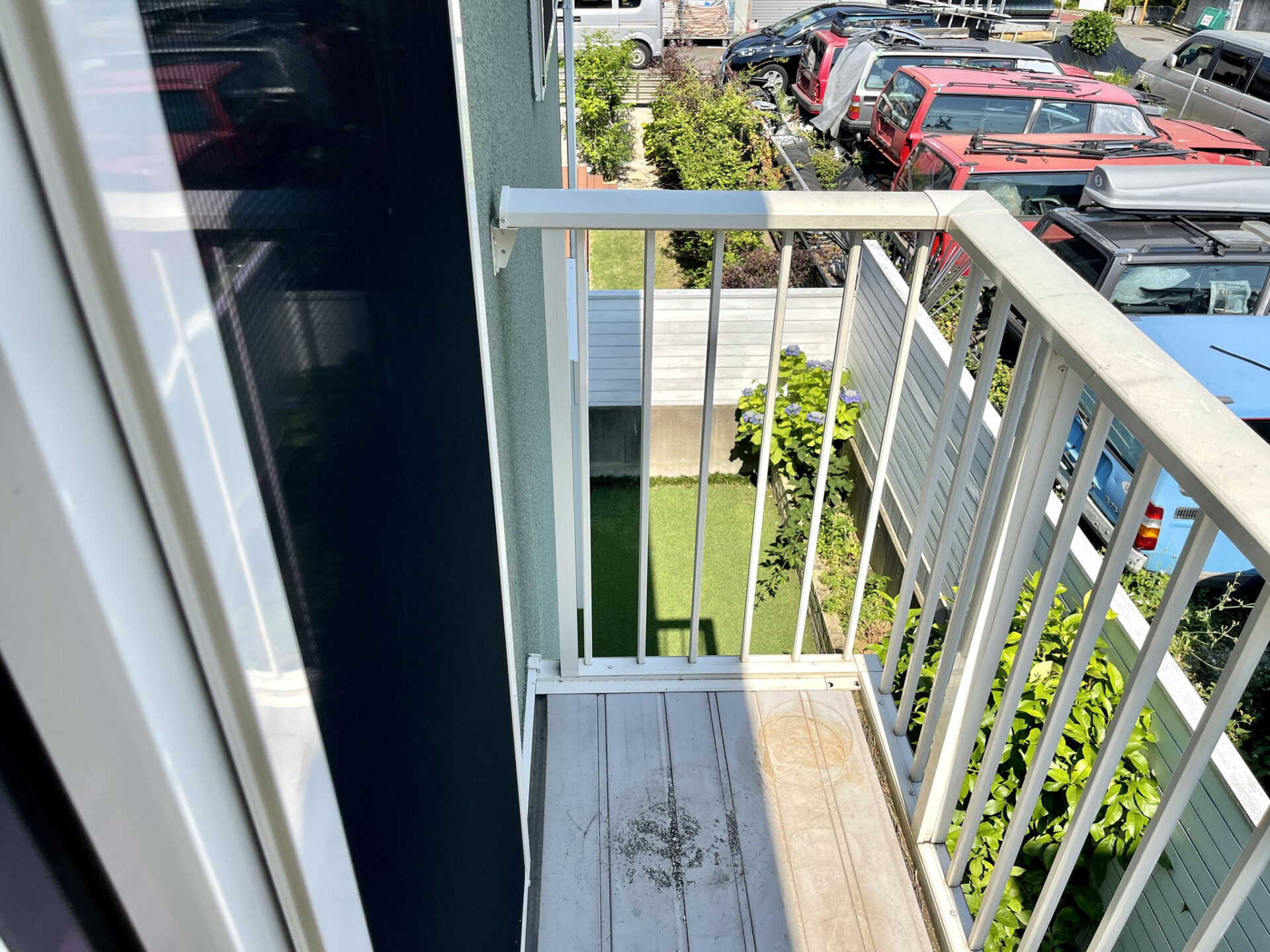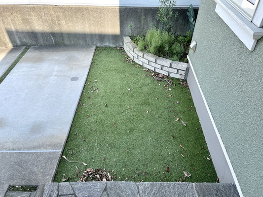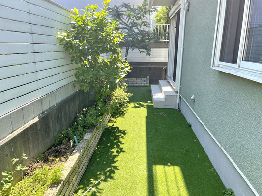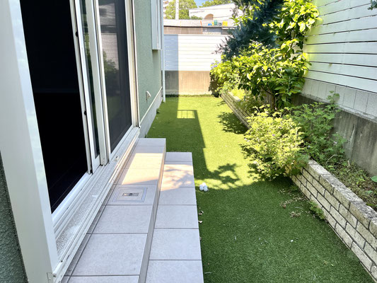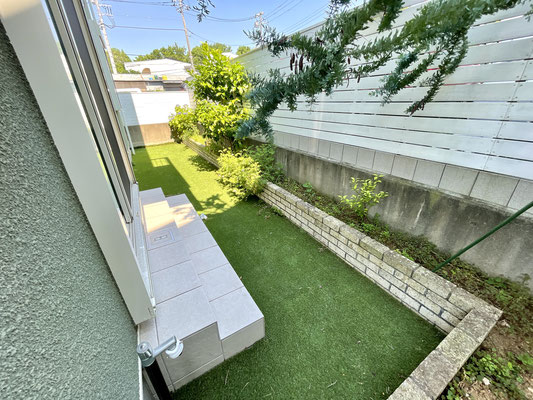 リアルな人工芝が敷かれたお庭はウッドな目隠しで仕切られています。