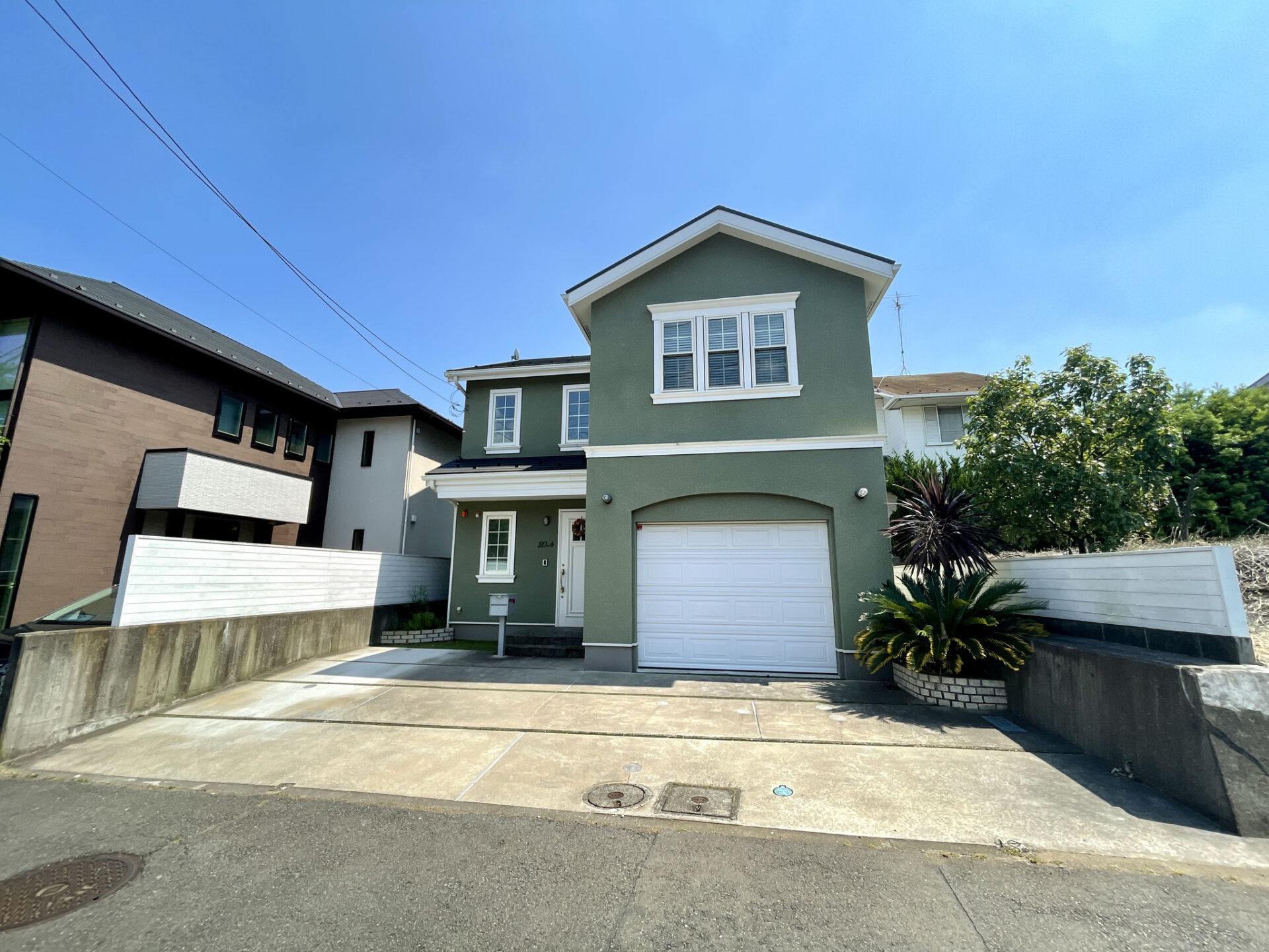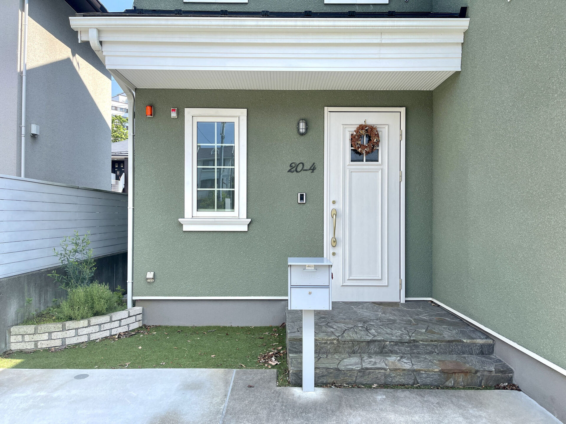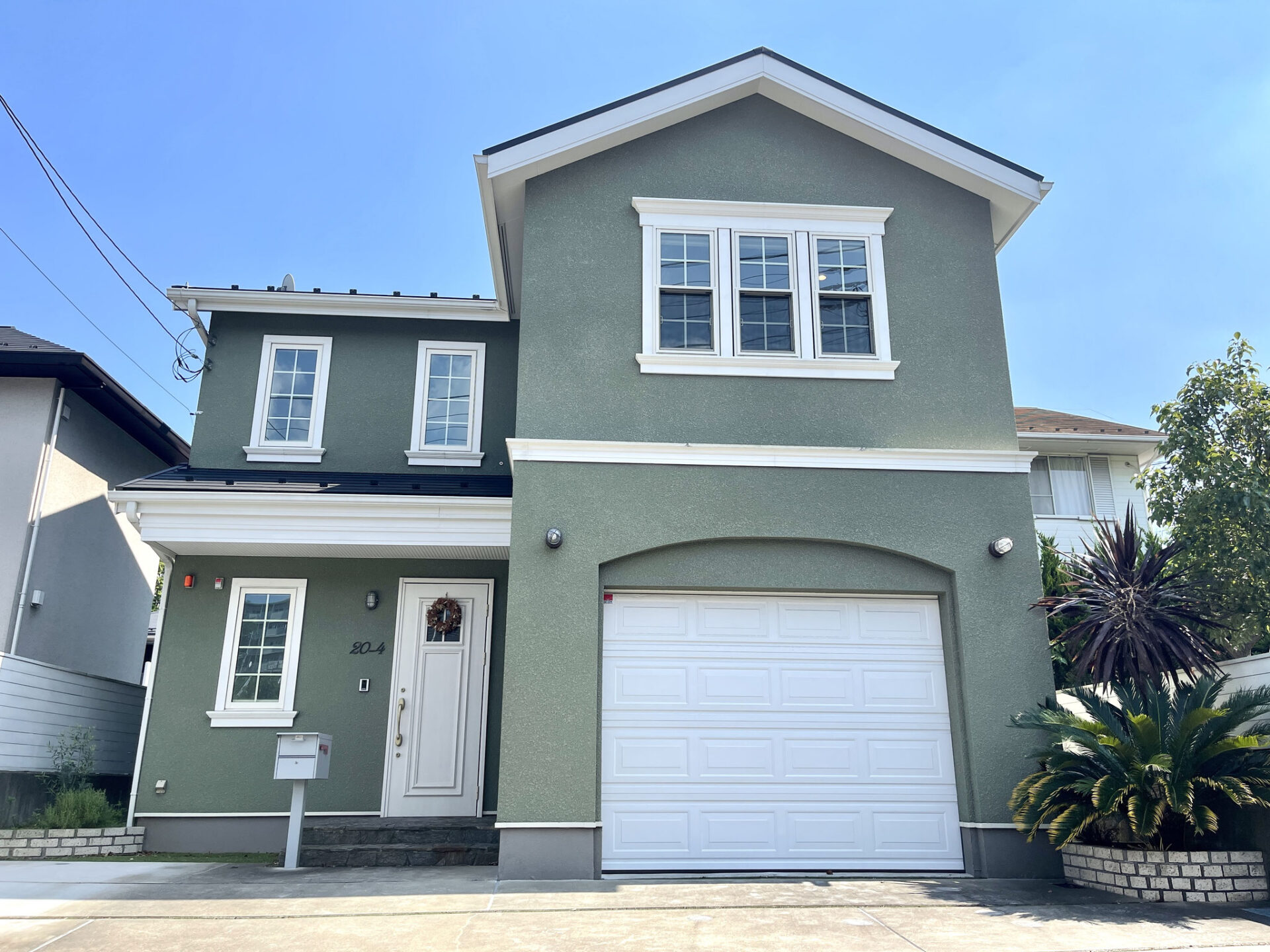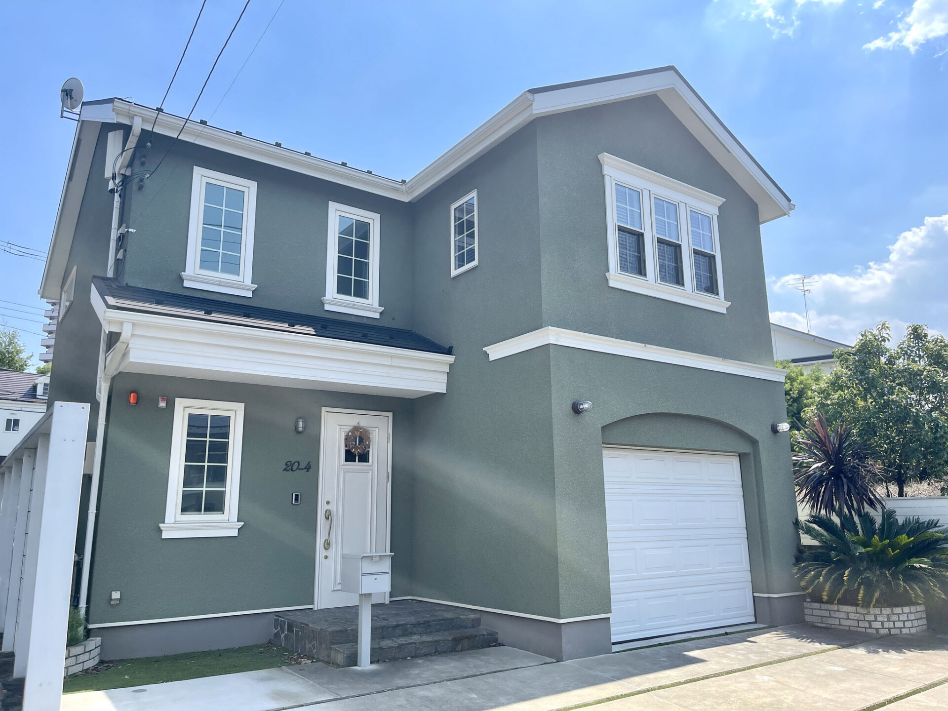建物外観はモスグリーンの外壁に白の窓枠やシャッターなどが