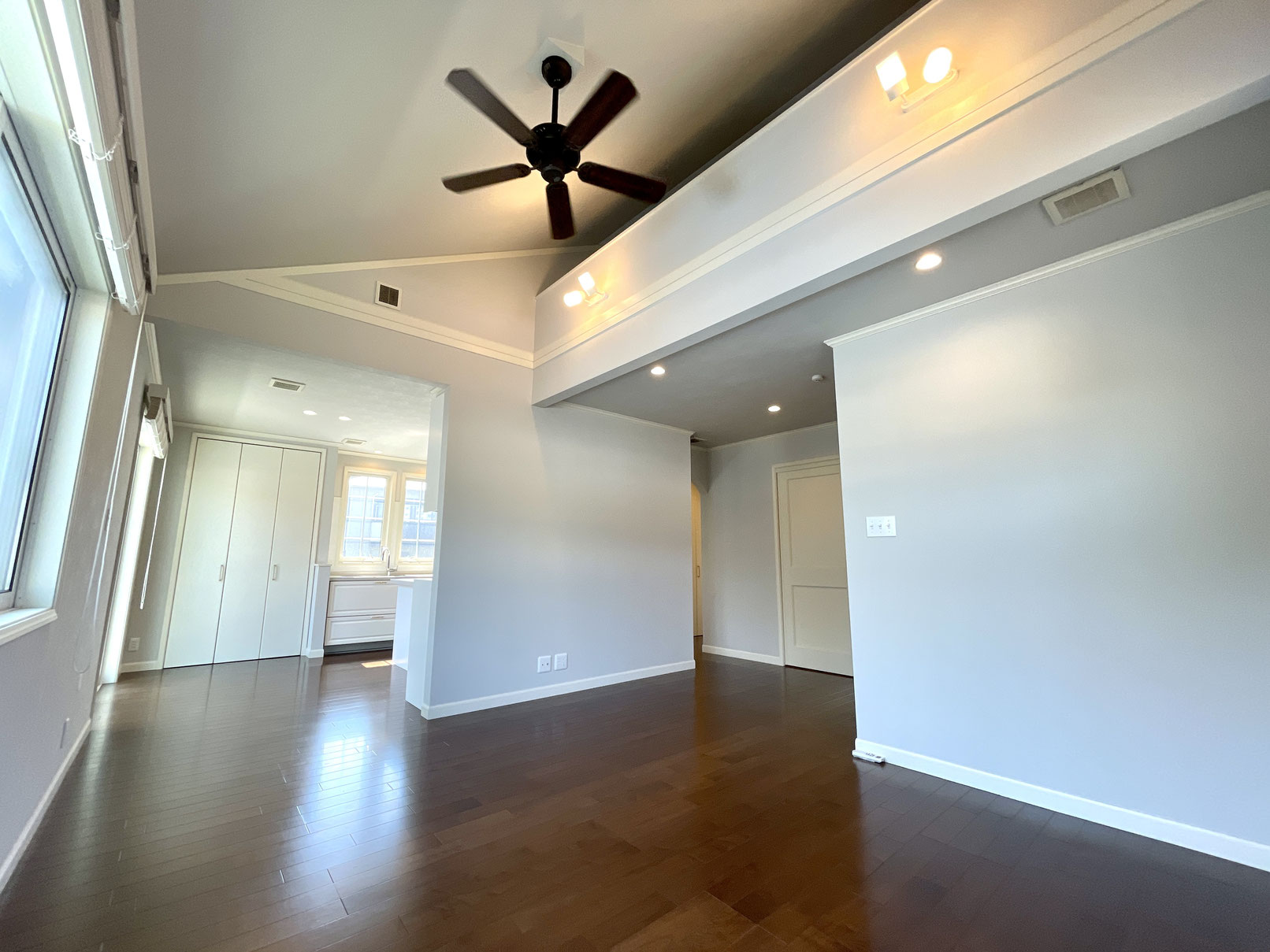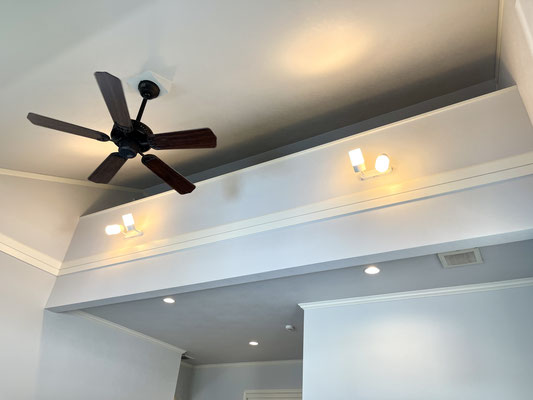 高い天井のリビングにはシーリングファンもあり、建物全体の空気を循環してくれます。