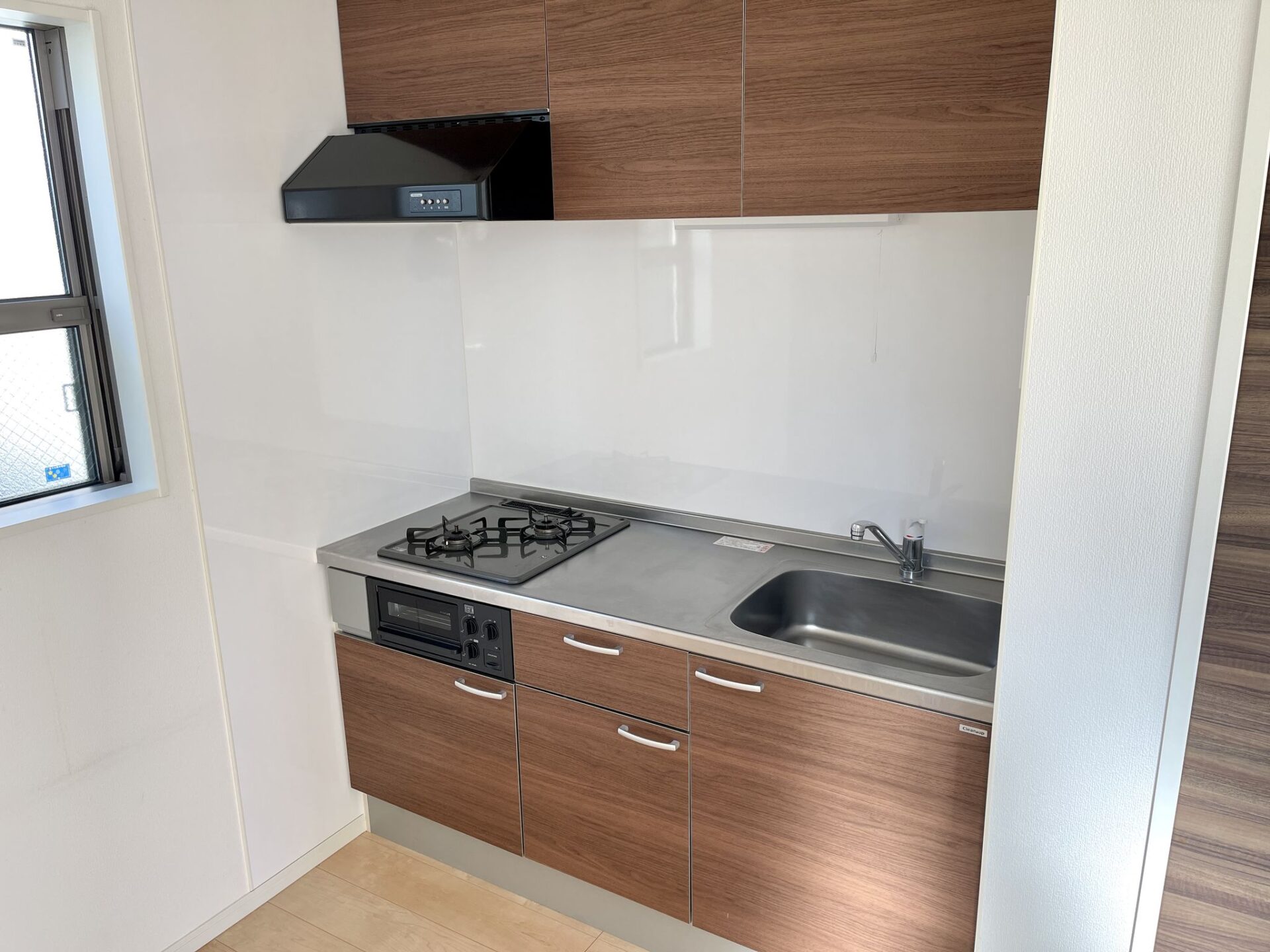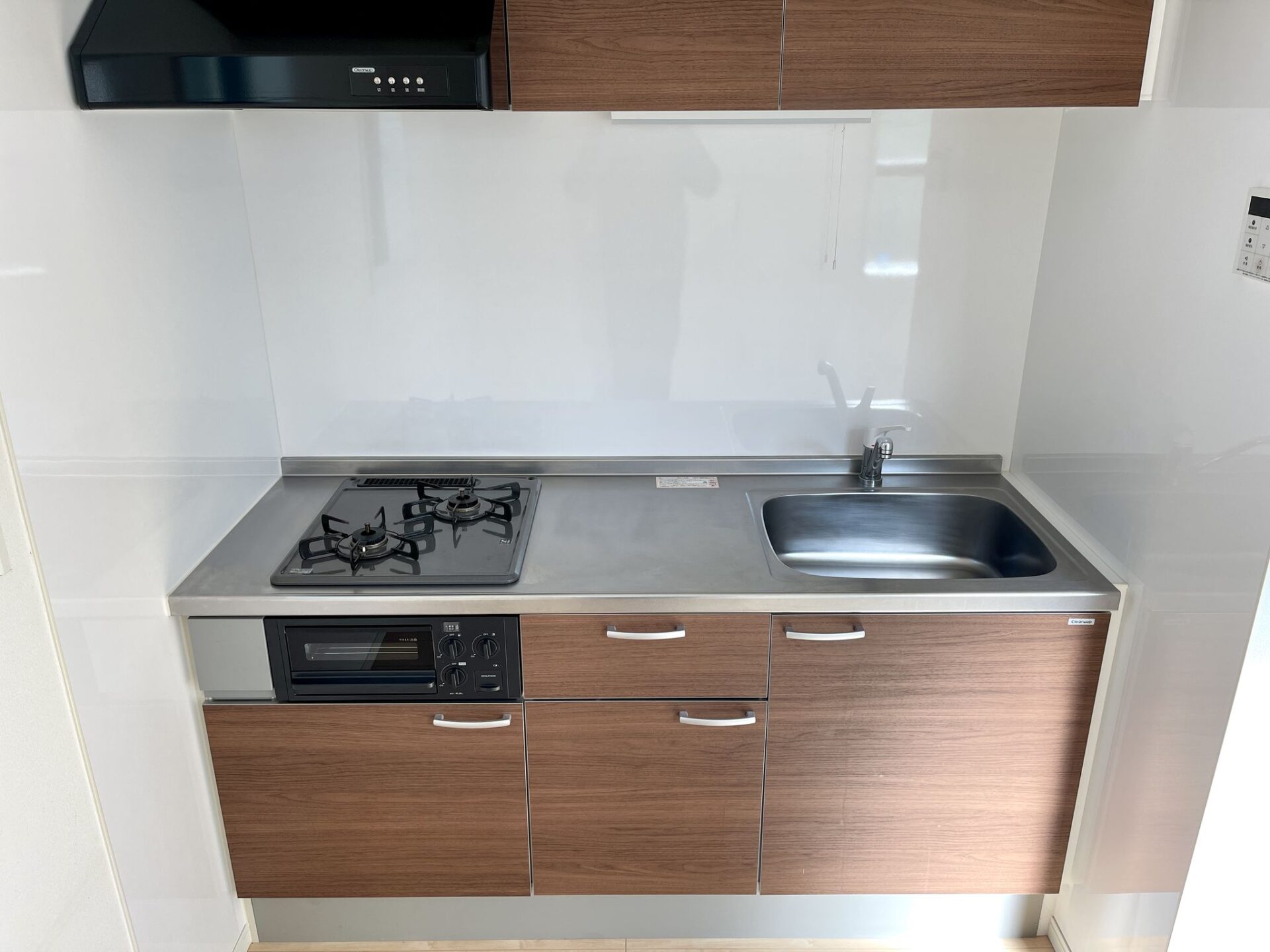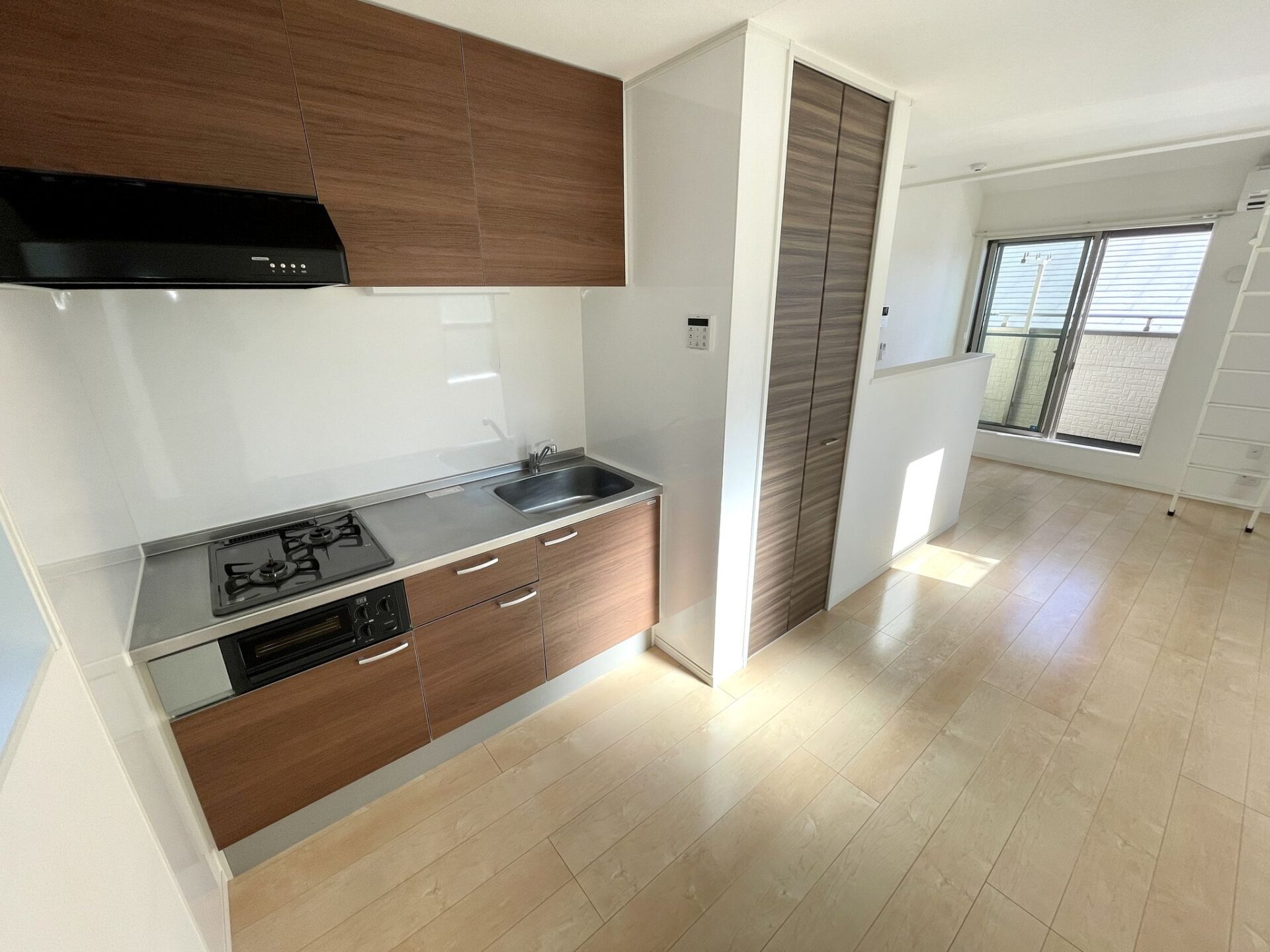お部屋の奥にあるキッチンは使い勝手が良さそうなシステムキッチン。