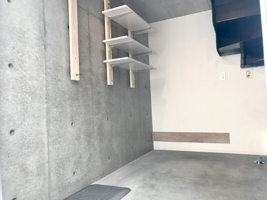 高さ調節の出来る棚は棚板を取り外して広くガレージを使うことも可能。