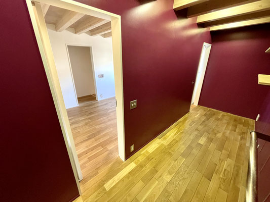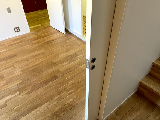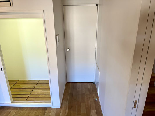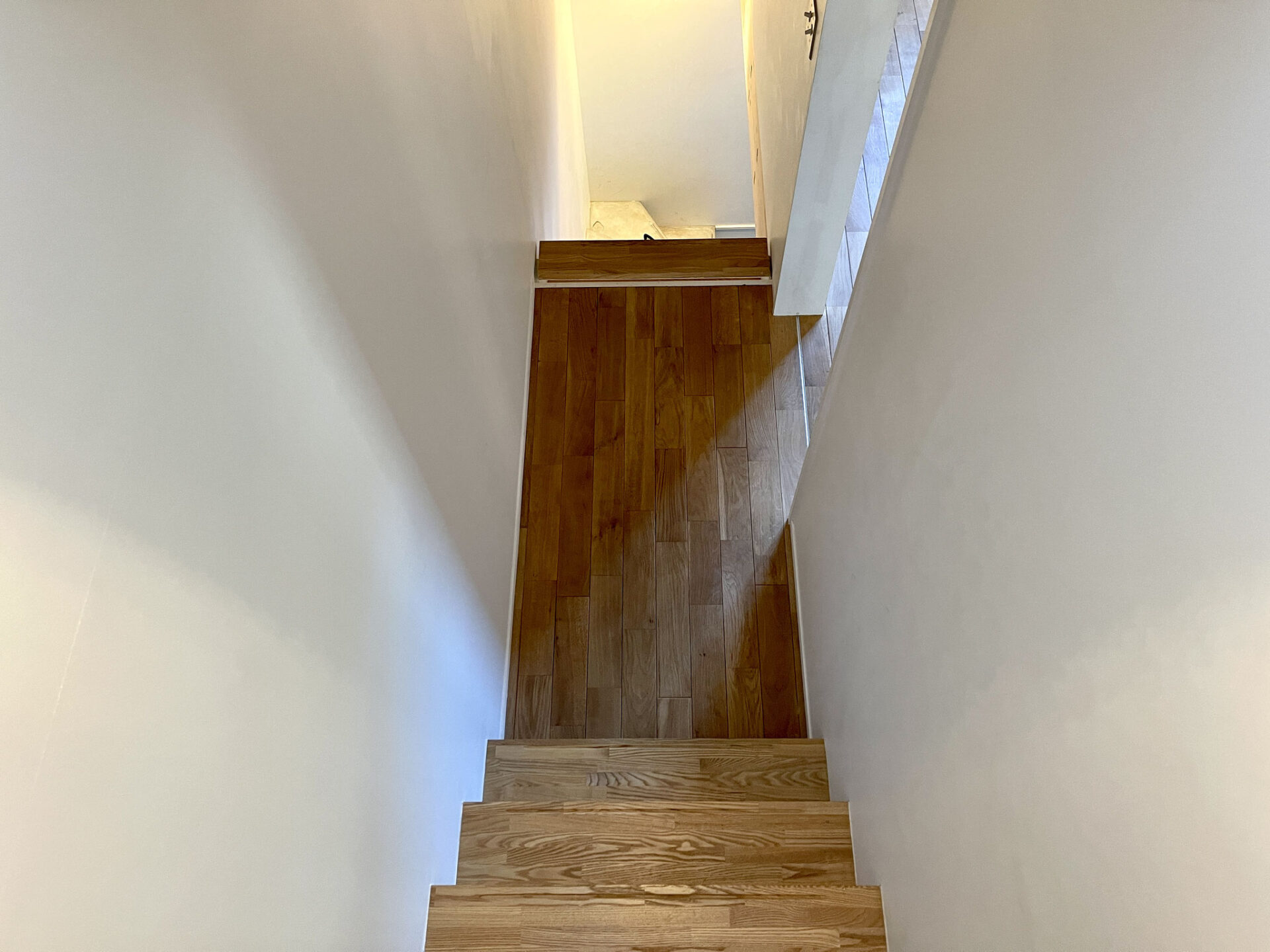 2階から見た階段スペース。主寝室のドアは引き戸になっています。