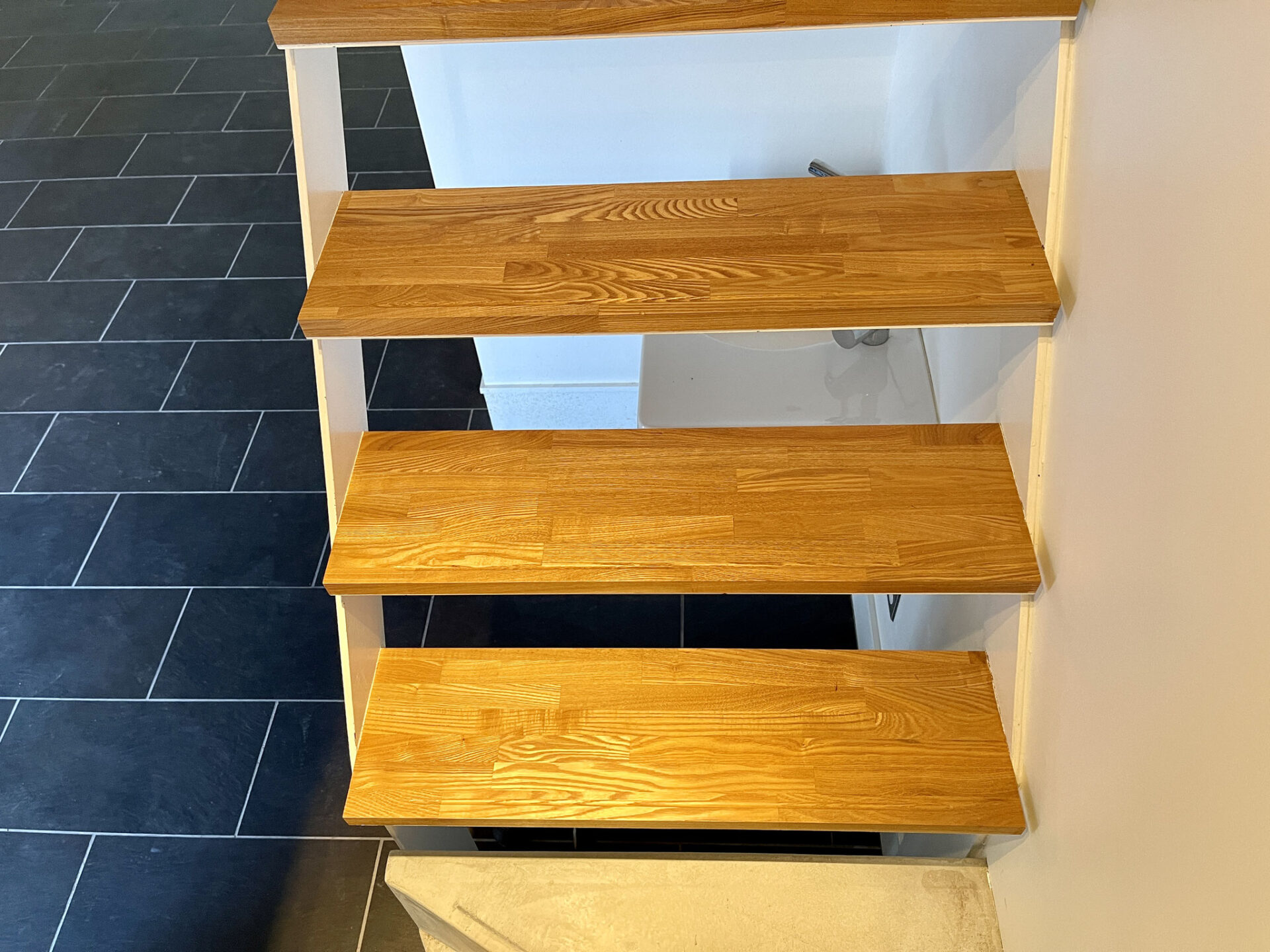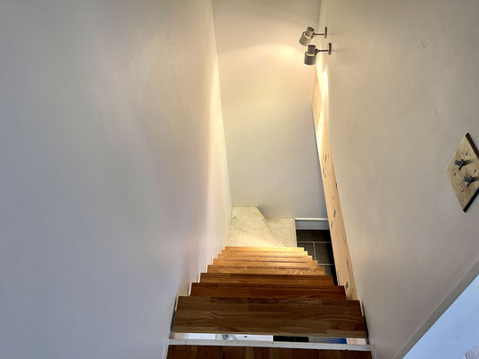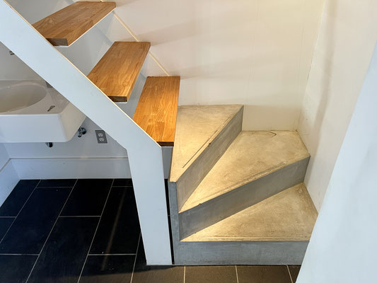 ガレージから住居スペースへ続く階段は、スッキリとしたデザイン。