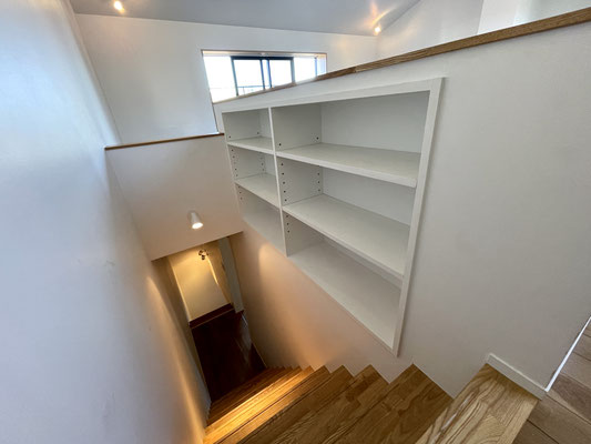 階段脇の壁にも収納スペースが。ここは飾り棚として使うのもアリかも♪