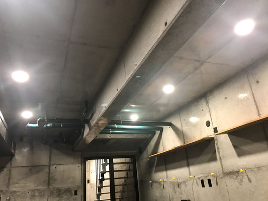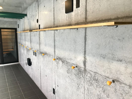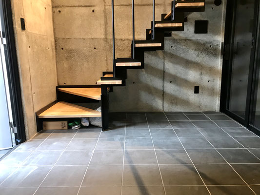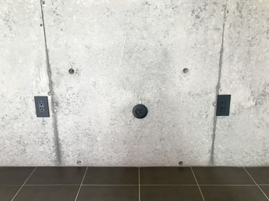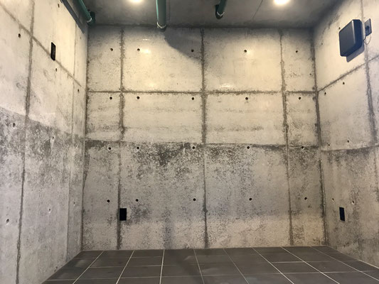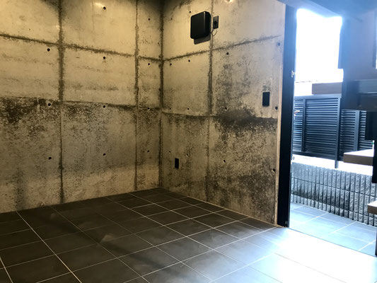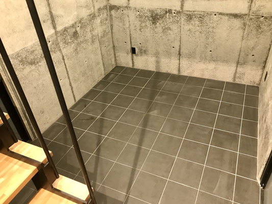 タイル床の黒と壁のコンクリートと相まって無骨な印象。
