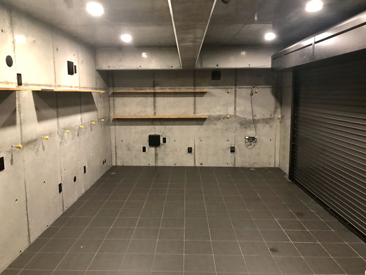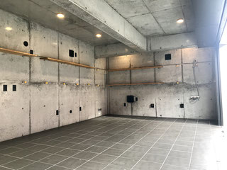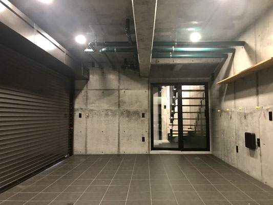 シャッターを開けると開放感のある横長なガレージ。