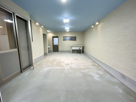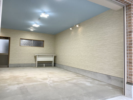 壁の白と天井のライトブルーが特徴的な爽やかガレージ!