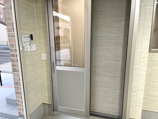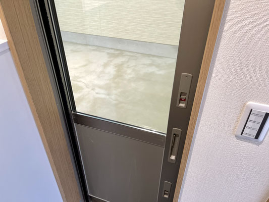 ガレージ内には玄関ホールに通じる網戸付きのスライドドア、建物裏手に出入り出来る裏口ドア、