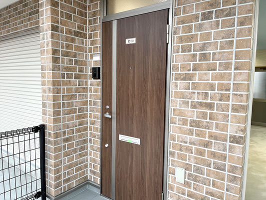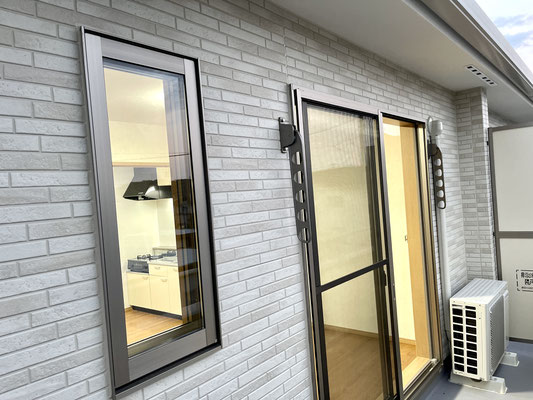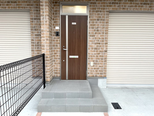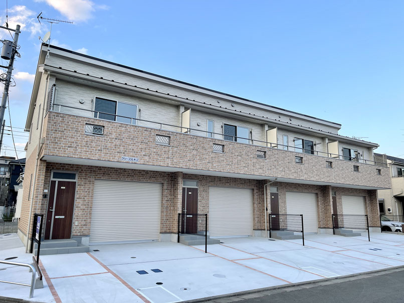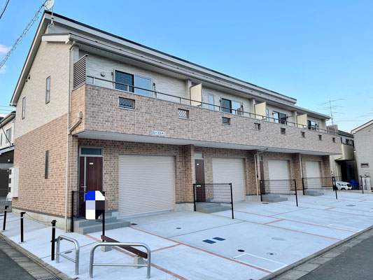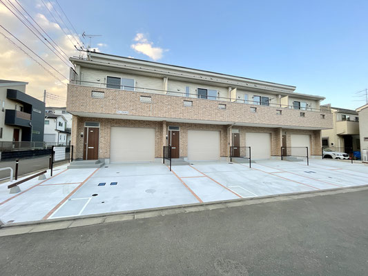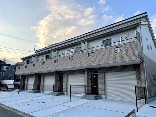 建物は連棟式の4戸物件。1階はレンガ調、2階は白系のサイディングで柔らかく温もりがあるイメージ。
