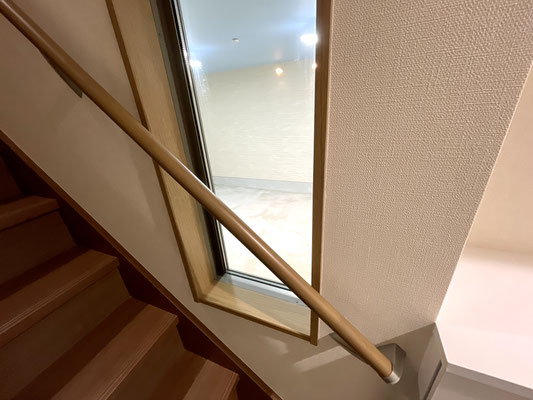 階段の途中にもガレージが見渡せる窓があります♪