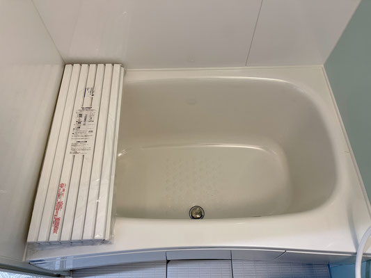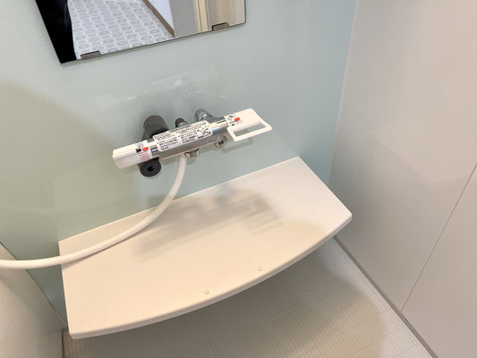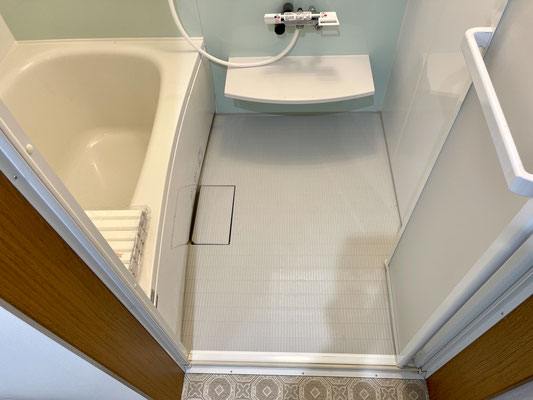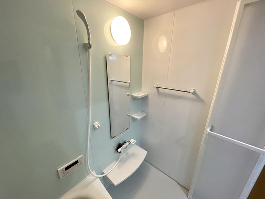 こちらもガレージ同様ライトブルーが爽やかな雰囲気のバスルームです。