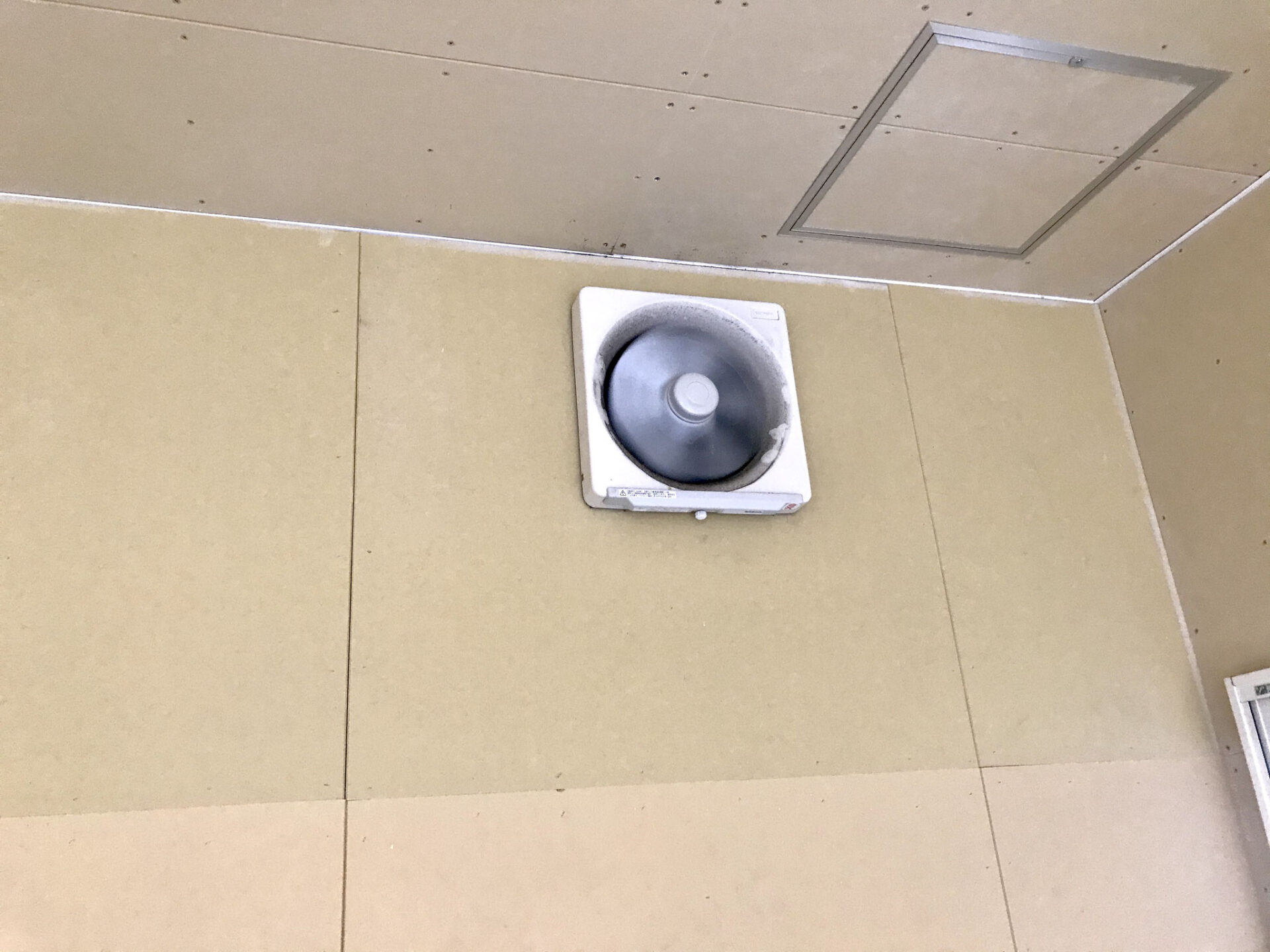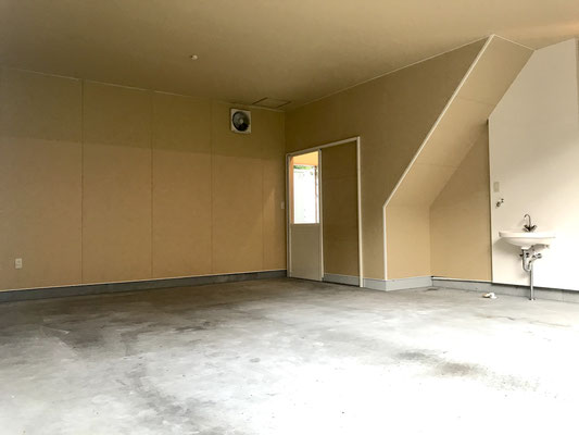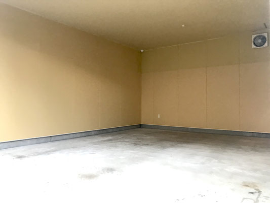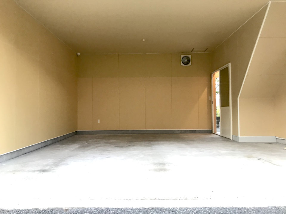 大型の換気扇ファンや各所に電源などもあり必要最低限ながら使い勝手の良さそうなガレージ。