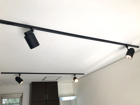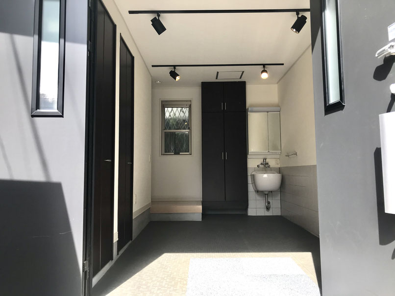 ガレージ内には階段下を利用した収納や下駄箱収納、鏡付きの水栓、ライティングレールも完備!