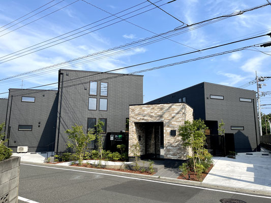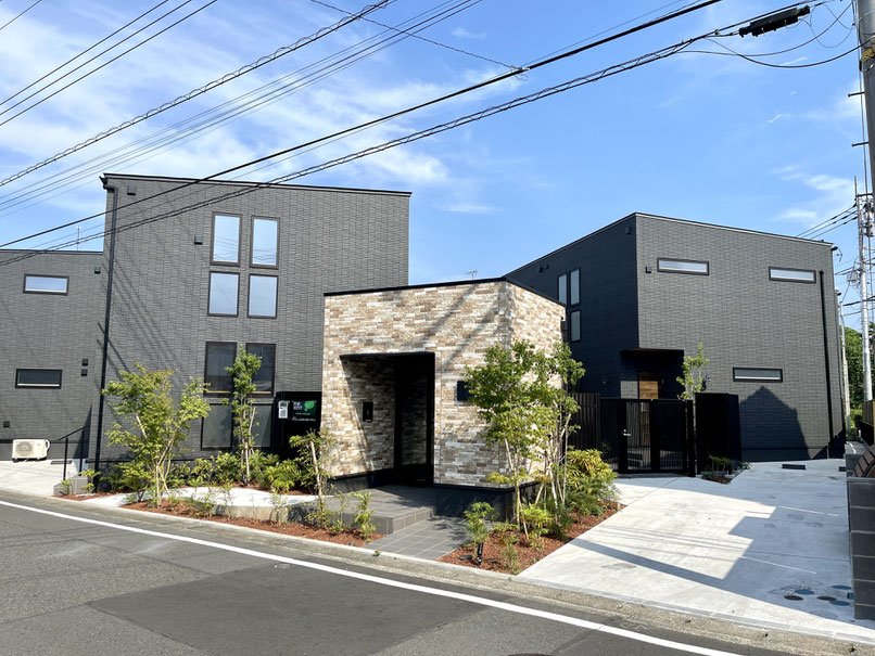 建物外観はブラックでまとめられ、縦長や横長のガラス窓がモダンでスタイリッシュな印象を持ちます。