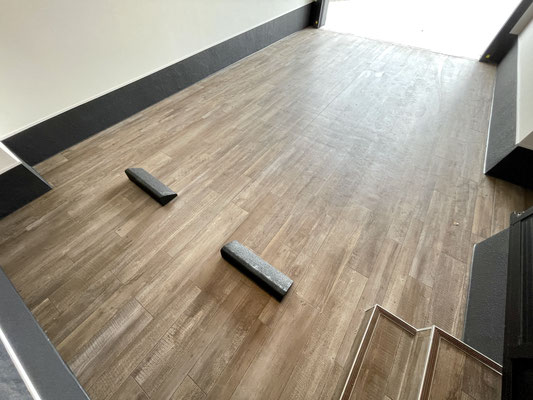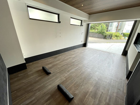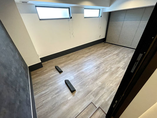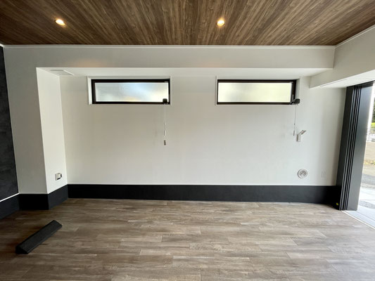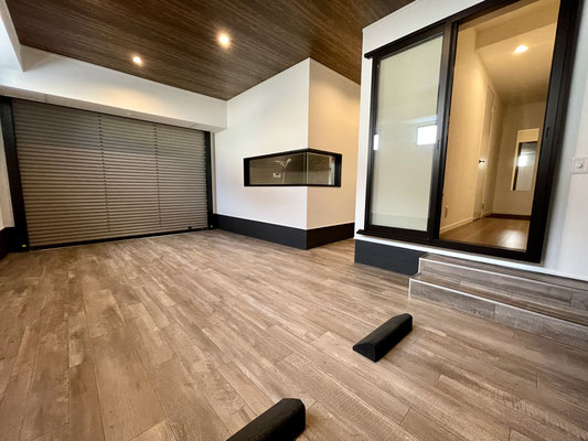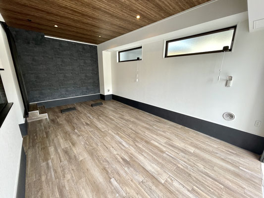 天井がウッド調になっているガレージは見たことがありますが、こちらは床もウッド調!!