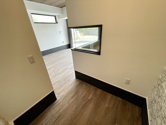 ガレージの壁にはスリットのような不思議なFIX窓と、その隣には小さな空間。