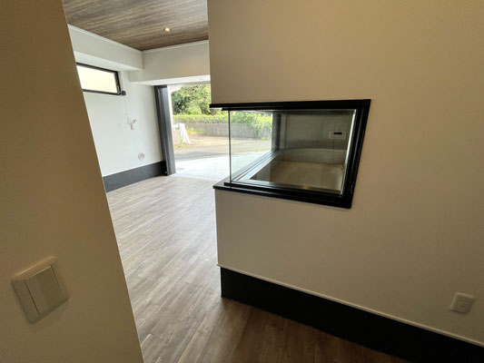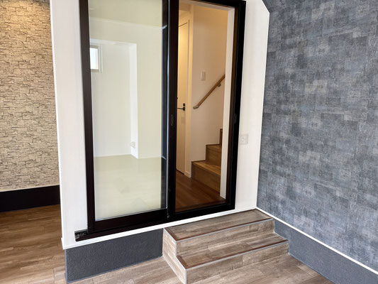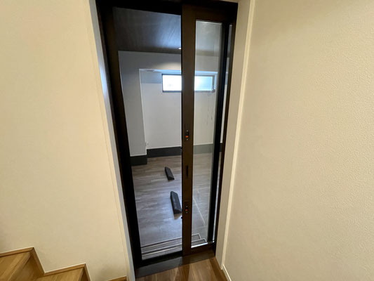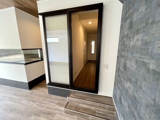 ガレージの中には居室にアプローチ出来るガラスのスライドドアや換気も出来る窓、