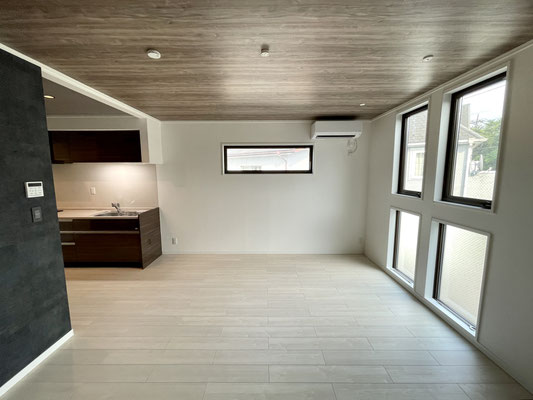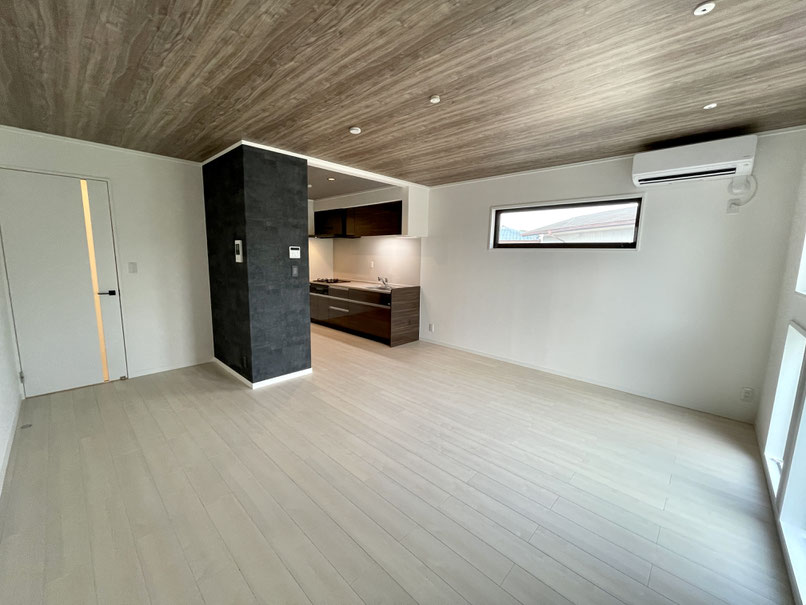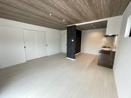 こちらはブラウン系のウッド調天井とホワイト系のウッド調フローリングが特徴的なLDK。