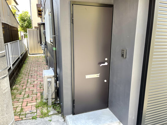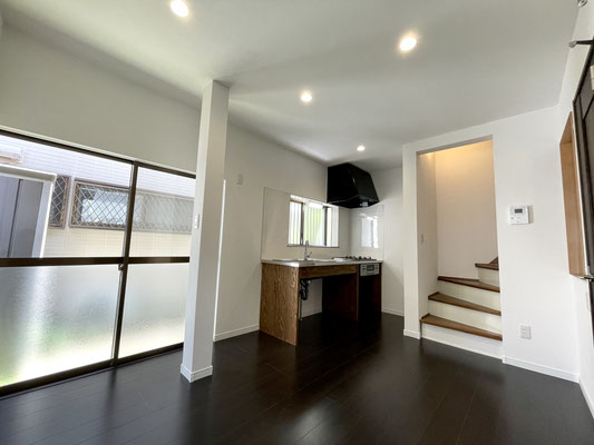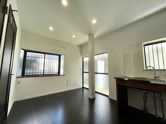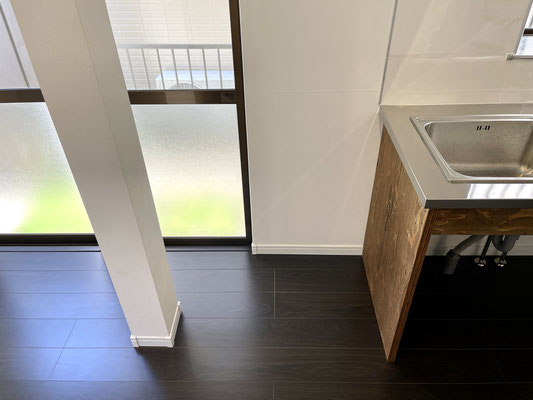 7.2帖のDKは濃い焦げ茶色のフローリングと新設されたヴィンテージテイストのドアが特徴的。