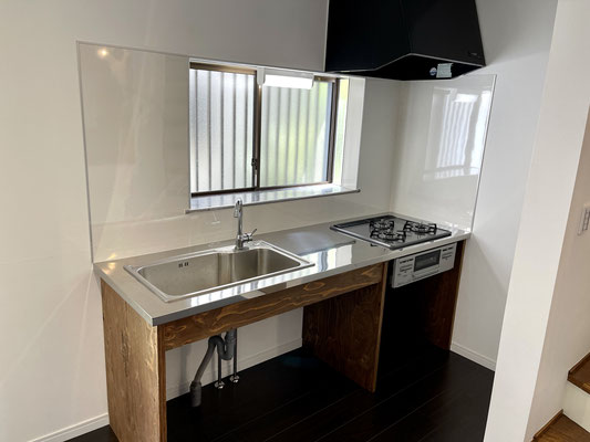 お部屋の中にあるキッチンはステンレスと木材を組み合わせたオシャレな仕様。