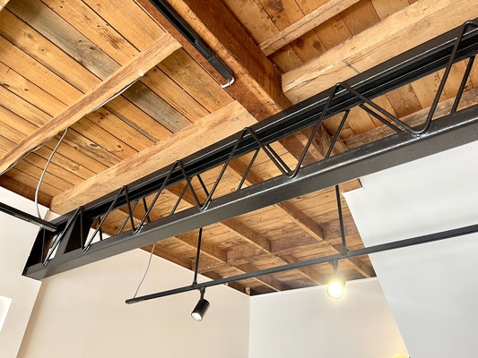 木造の建物ですが天井にある鉄骨がインダストリアルな雰囲気を醸し出していて良いね〜