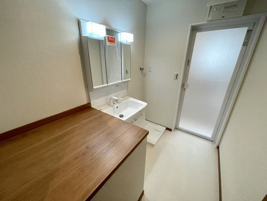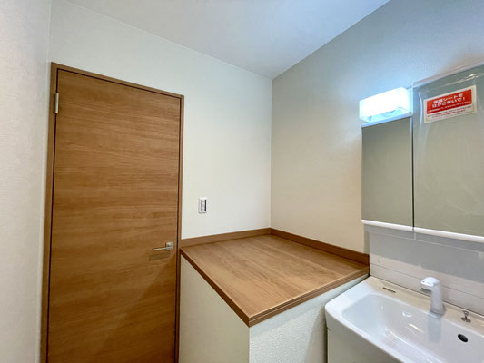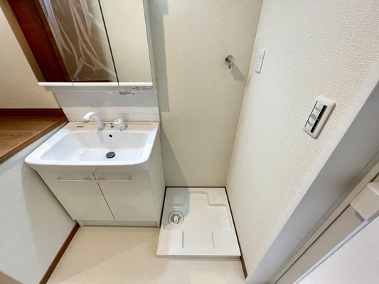 洗面台と洗濯機置場を備えた脱衣所になっていて、日々の支度や家事がしやすい機能的な空間です。