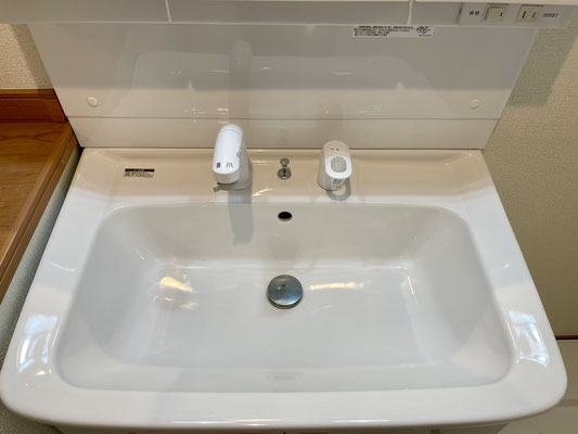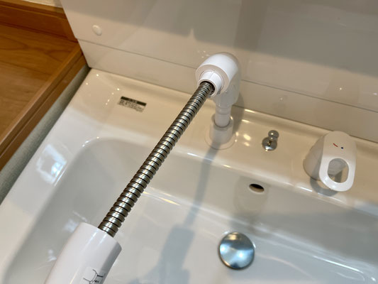 蛇口は引き出せるシャワータイプで、洗面ボウルのお手入れやちょっとした洗い物にも便利です。