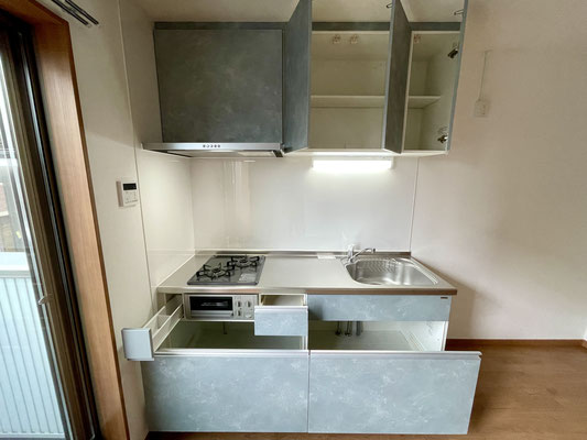 2口コンロに加えて魚焼きグリルもついていて、しっかり自炊を楽しみたい方にもぴったり!