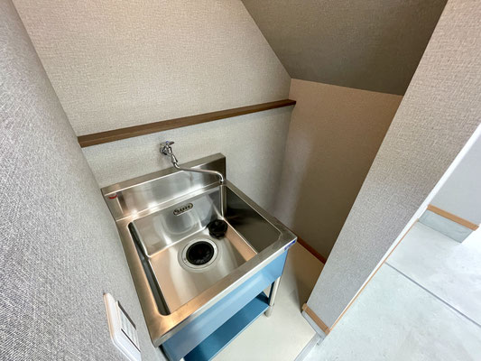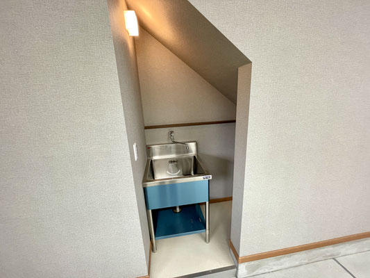 階段下には水栓もあって、日常的な掃除やちょっとした作業に便利です。