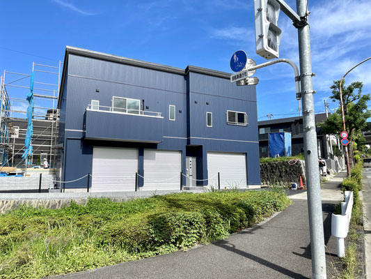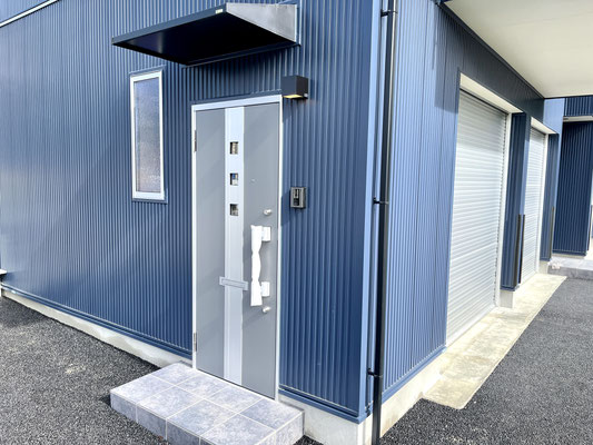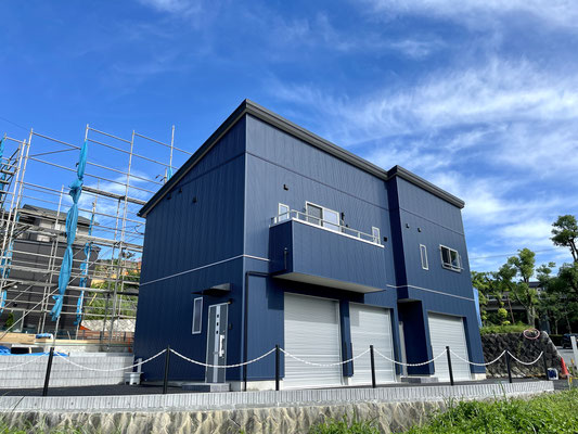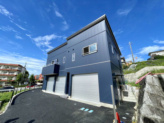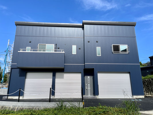 建物外観はブルーのガルバリウム外壁とシルバーのガレージシャッターが特徴的。