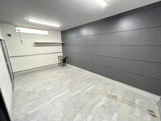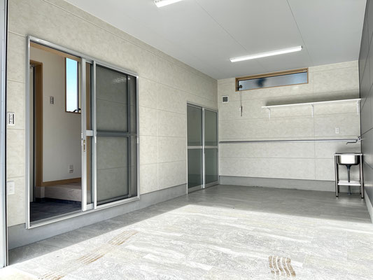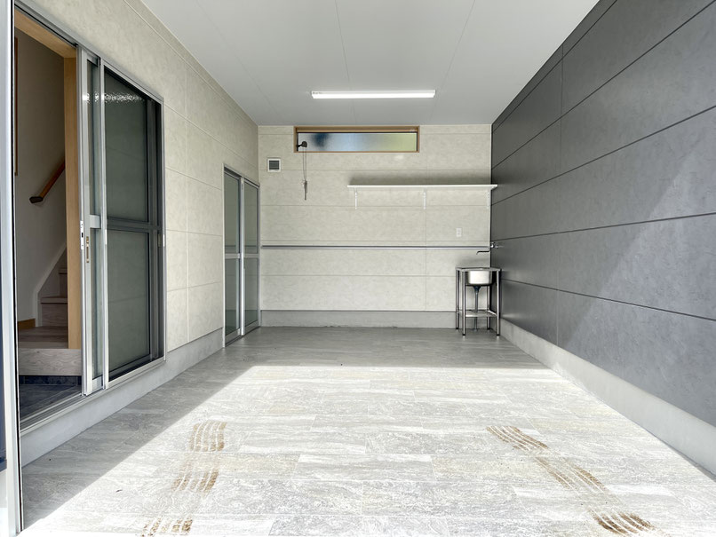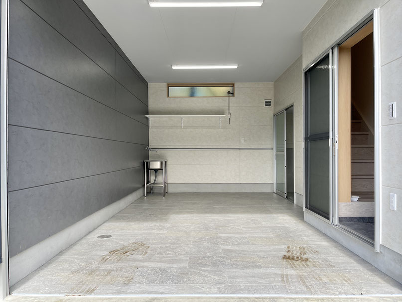 ガレージ内には扉付きの収納や手洗い水栓、換気の出来る窓や棚などもあります。
