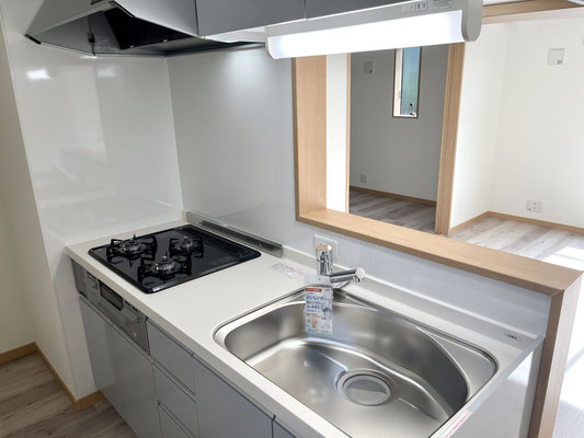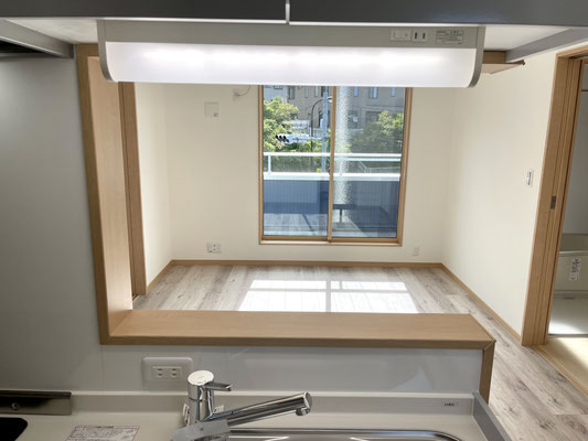 シンクがあるカウンター越しにお部屋を見渡すことが出来ます。