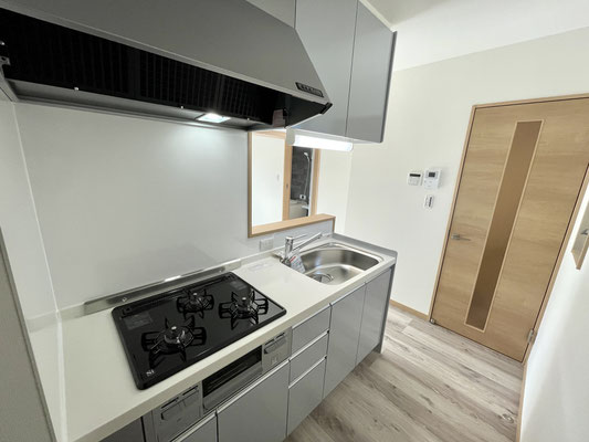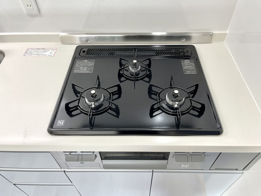 3口コンロは魚焼きグリル付きで換気ダクトも大型!