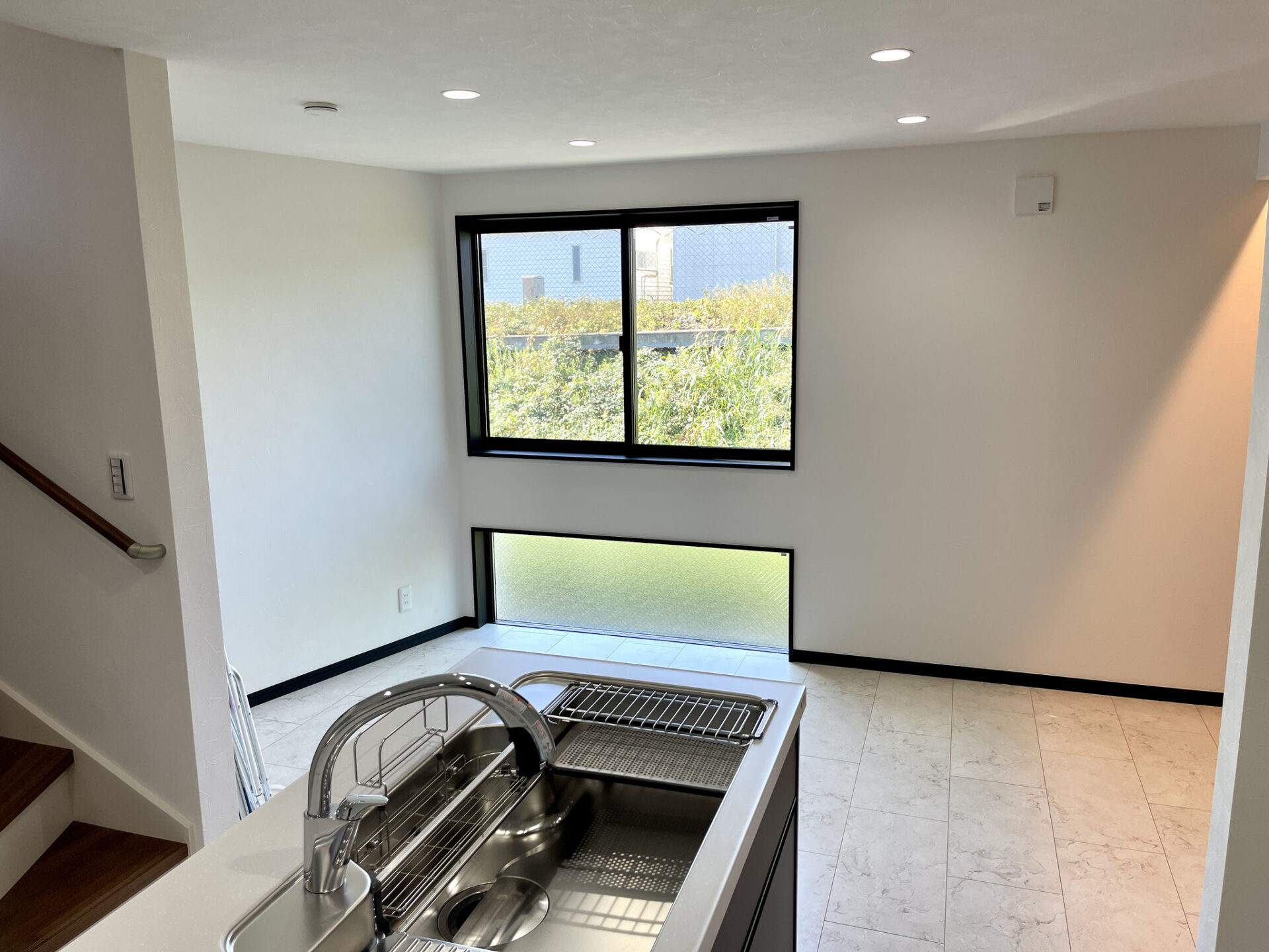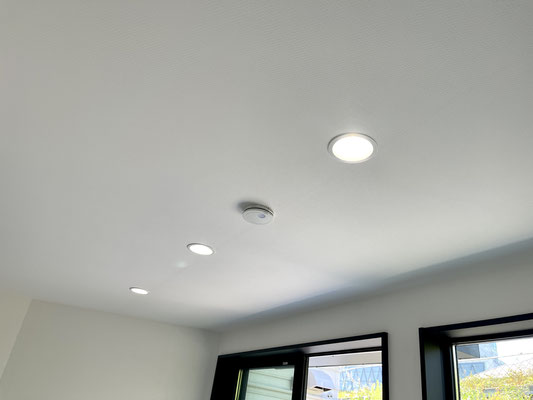 天井には埋込み型のダウンライトも設置済でまるでモデルルームのような清潔感のあるリビング。