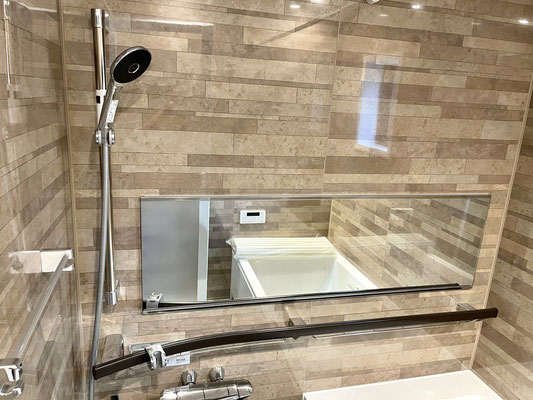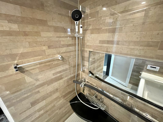 物件のサイズ感からしても大きめなバスルームはライトブラウンで落ち着く空間。